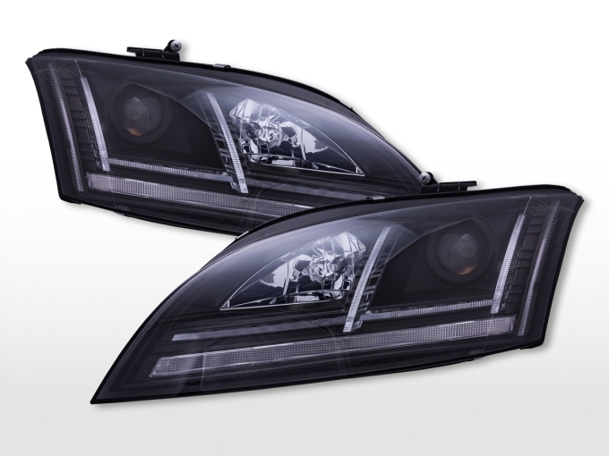 Daylight Scheinwerfer mit LED Standlicht Audi TT (8J) Baujahr 2006-2011 schwarzDie Daylight Scheinwerfer gehören zu den Kultscheinwerfern und verschönern nicht nur die Optik des Fahrzeuges bei Tag, sondern auch bei Nacht. Die LED Stripes lassen Ihr Auto in einer ganz neuen Optik erstrahlen. Bei den Scheinwerfer sehen Sie zwei horizontale und zwei vertikale Stripes, die mit LEDs beleuchtet werden. Dies führt zu einer sportlichen oder auch aggressiveren Optik.Einbauanleitung: Die Scheinwerfer werden komplett mit Kabelbaum und einer Einbauanleitung ausgeliefert. Die Qualität: der Scheinwerfer ist in Erstausrüsterqualität und werden von namhaften Produzenten für den Tuningbereich produziert. Der Preis: Im Regelfall sind diese Tuningscheinwerfer immer günstiger als die Originalen Scheinwerfer. Hier lohnt sich ein Preischeck, selbst wenn nur im Falle eines Unfalls nur ein Scheinwerfer defekt sein sollte. Weitere Ausführungsdetails: Scheinwerfer Klarglasoptik mit transparenter Streuscheibeverbesserte Lichtausbeute durch Klarglasscheibe und verbesserten Reflektorenwenn nicht anders angegeben inkl. elektrischer LWR (Leuchtweitenregulierung) Anschluss erfolgt über fahrzeugspezifischen Stecker Leuchtmittel sind im Lieferumfang nicht enthaltenkeine Eintragung und Eintragungskosten in die Papiere nötig, da mit "E" Prüfzeichen versehen Einfache Montage da die Originalscheinwerfer Befestigungspunkte des Fahrzeugs verwendet Lieferumfang:1 Satz LED Daylight Scheinwerfer (links + rechts)