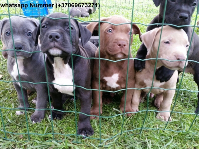 .#'Unsere 4 Pit Bull Welpen sind nun 10 Wochen alt und dürfen in ein neues zuhause einziehen. Es sind jetzt noch 2 Mädchen und 2 Jungs. Sie kennen den Umgang mit klein Kindern und größeren. Auch die normalen altagsgeräusche kennen Sie schon. Sind alle Kern gesund! Sie sind gechipt geimpft und entwurmt. Heimtierausweis damit sie auf reisen gehen können Ist natürlich vorhanden. Bitte kontaktieren Sie uns direkt auf whatsapp Nummer (+37069673271)