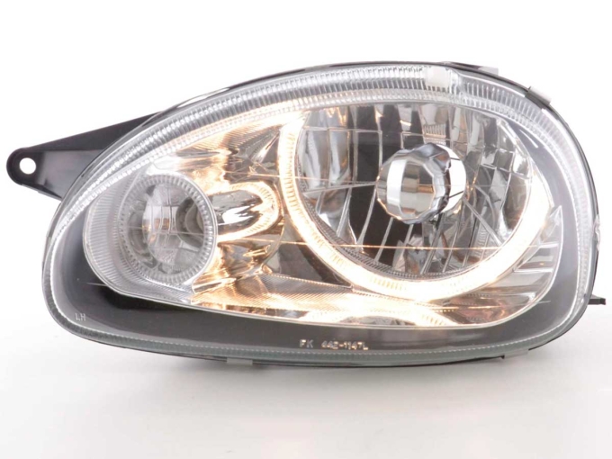 Scheinwerfer Angel Eyes Opel Corsa B Bj. 93-00 chromDie Angel Eyes Scheinwerfer gehören zu denKultscheinwerfern und verschönern nicht nur die Optik des Fahrzeuges bei Tagsondern auch bei Nacht! Die sogenannten Engelaugen lassen Ihr Auto in einerganz neuen Optik erstrahlen. Bei den Scheinwerfer sehen Sie um den Reflektoreine runden Ring, der mit dahinterliegenden Birnen beleuchtet wird. Dank derbeiden LED Ringe erhalten sie ein helles weißes Licht mit einemunverwechselbaren Tuning Look. Im Regelfall hat der Scheinwerfer zweibeleuchtete Angel Eyes Ringe was zu einer sportlichen oder auch aggressiverenOptik führt.KEINE KOSTEN EINTRAGUNGSFREI: Die Angel EyesScheinwerfer werden mit e-Zeichen ausgeliefert und sind somit eintragungsfrei. GERINGE EINBAUKOSTEN: Die Angel EyesScheinwerfer können problemlos von jeder Fachwerkstatt binnen ca. 2 Stundeneingebaut werden.Einbauanleitung: Die Scheinwerferwerden komplett mit Kabelbaum und einer "englischen" Einbauanleitungausgeliefert. Die Qualität: der Scheinwerferist mit Erstausrüsterqualität zu vergleichen und werden von namhaftenProduzenten für den Tuningbereich produziert. Der Preis: Im Regelfall sinddiese Tuningscheinwerfer immer günstiger als die Originalen Scheinwerfer. Hierlohnt sich ein Preischeck, selbst wenn nur im Falle einen Unfalls nur ein Scheinwerferdefekt sein sollte. Die Angel Eyes Scheinwerfer sind eine günstigeUmrüstmöglichkeit im Falle eines Unfalls oder eine Nachrüstung.Die Scheinwerfer Technik: Die Scheinwerfersind nicht nur technisch sondern auch optisch ausgereift und sind im übrigenschon 100.000 fach erfolgreich weltweit eingebaut. Sie möchten Ihrem Fahrzeugeine sportliche Note geben? Dann sollten Sie gleich dieses tolleScheinwerferset bestellen.WeitereAusführungsdetails: · ScheinwerferKlarglasoptik mit transparenter Streuscheibe· verbesserteLichtausbeute durch Klarglasscheibe und verbesserter Reflektoren· wennnicht anders angegeben inkl. elektrischer LWR ( Leuchtweitenregulierung ) · Anschlusserfolgt über fahrzeugspezifischen Stecker · Leuchtmittelsind im Lieferumfang nicht enthalten· keineEintragung und Eintragungskosten in die Papiere nötig, da mit "E"Prüfzeichen versehen · EinfacheMontage da die Original Scheinwerfer Befestigungspunkte des Fahrzeugs verwendet!· LangeLebensdauer durch die Verwendung von hochwertigen Material undChormbeschichtungenLieferumfang:· 1Satz Scheinwerfer( links + rechts ) mit Blinkleuchten