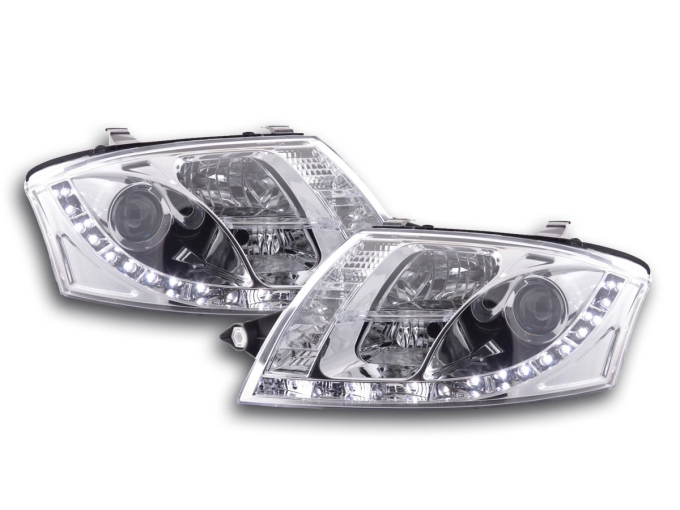 Scheinwerfer Daylight Audi TT Typ 8N Bj. 99-06 chromDie Daylight Scheinwerfer weisen nicht nur in der Nacht sondern auch schon am Tag eine hervorragende sportliche Erscheinung für Ihr Auto aus. Die Eleganten LEDs verleihen Ihrem Auto eine Top Tuning Optik und nebenbei werden Sie auch noch von den anderen Verkehrsteilnehmer besser wahrgenommen! Mit dem Austausch Ihrer Serienscheinwerfer in die Daylightscheinwerfer erhalten Sie eine komplett neue zeitlose exklusive und sportliche Fahrzeugoptik! Nur nebenbei bemerkt sind die Daylight-Scheinwerfer das abgesagteste Design in Sachen Tuningscheinwerfer und verleihen Ihrem Fahrzeug auch eine sportlich aggressive Optik bei Tag und bei Nacht!KEINE KOSTEN EINTRAGUNGSFREI: Die Daylight Scheinwerfer werden mit e-Zeichen ausgeliefert und sind somit eintragungsfrei. GERINGE EINBAUKOSTEN: Die Daylight Scheinwerfer mit integrierten Tagfahrlicht oder auch Tagfahrleuchte genannt können problemlos von jeder Fachwerkstatt binnen ca. 2 Stunden eingebaut werden. Einbauanleitung: Die Scheinwerfer werden komplett mit Kabelbaum und einer "englischen" Einbauanleitung ausgeliefert. Die Qualität: der Scheinwerfer ist mit Erstausrüsterqualität zu vergleichen und werden von namhaften Produzenten für den Tuningbereich produziert. Der Preis: Im Regelfall sind diese Tuningscheinwerfer immer günstiger als die Originalen Scheinwerfer. Hier lohnt sich ein Preischeck, selbst wenn nur im Falle einen Unfalls nur ein Scheinwerfer defekt sein sollte. Die Daylight Scheinwerfer sind eine günstige Umrüstmöglichkeit im Falle eines Unfalls oder eine Nachrüstung.Die Scheinwerfer Technik: Die Scheinwerfer sind nicht nur technisch sondern auch optisch ausgereift und sind im übrigen schon 100.000 fach erfolgreich weltweit eingebaut. Sie möchten Ihrem Fahrzeug eine sportliche Note geben? Dann sollten Sie gleich dieses tolle Scheinwerferset bestellen. Weitere Ausführungsdetails: Scheinwerfer Klarglasoptik mit transparenter Streuscheibeverbesserte Lichtausbeute durch Klarglasscheibe und verbesserter Reflektorenwenn nicht anders angegeben inkl. elektrischer LWR ( Leuchtweitenregulierung ) Anschluss erfolgt über fahrzeugspezifischen Stecker Leuchtmittel sind im Lieferumfang nicht enthaltenkeine Eintragung und Eintragungskosten in die Papiere nötig, da mit "E" Prüfzeichen versehen Einfache Montage da die Original Scheinwerfer Befestigungspunkte des Fahrzeugs verwendet !Lange Lebensdauer durch die Verwendung von hochwertigen Material und ChormbeschichtungenLieferumfang:1 Satz Scheinwerfer ( links + rechts )