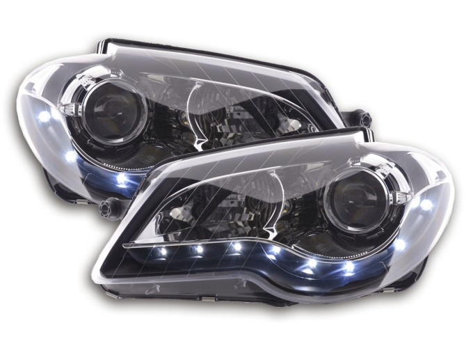 Scheinwerfer Daylight VW Touran Typ 1T Bj. 06-10 schwarzDie Daylight Scheinwerfer weisen nicht nur in der Nacht sondern auch schon am Tag eine hervorragende sportliche Erscheinung für Ihr Auto aus. Die Eleganten LEDs verleihen Ihrem Auto eine Top Tuning Optik und nebenbei werden Sie auch noch von den anderen Verkehrsteilnehmer besser wahrgenommen! Mit dem Austausch Ihrer Serienscheinwerfer in die Daylightscheinwerfer erhalten Sie eine komplett neue zeitlose exklusive und sportliche Fahrzeugoptik! Nur nebenbei bemerkt sind die Daylight-Scheinwerfer das abgesagteste Design in Sachen Tuningscheinwerfer und verleihen Ihrem Fahrzeug auch eine sportlich aggressive Optik bei Tag und bei Nacht!KEINE KOSTEN EINTRAGUNGSFREI: Die Daylight Scheinwerfer werden mit e-Zeichen ausgeliefert und sind somit eintragungsfrei. GERINGE EINBAUKOSTEN: Die Daylight Scheinwerfer mit integrierten Tagfahrlicht oder auch Tagfahrleuchte genannt können problemlos von jeder Fachwerkstatt binnen ca. 2 Stunden eingebaut werden. Einbauanleitung: Die Scheinwerfer werden komplett mit Kabelbaum und einer "englischen" Einbauanleitung ausgeliefert. Die Qualität: der Scheinwerfer ist mit Erstausrüsterqualität zu vergleichen und werden von namhaften Produzenten für den Tuningbereich produziert. Der Preis: Im Regelfall sind diese Tuningscheinwerfer immer günstiger als die Originalen Scheinwerfer. Hier lohnt sich ein Preischeck, selbst wenn nur im Falle einen Unfalls nur ein Scheinwerfer defekt sein sollte. Die Daylight Scheinwerfer sind eine günstige Umrüstmöglichkeit im Falle eines Unfalls oder eine Nachrüstung.Die Scheinwerfer Technik: Die Scheinwerfer sind nicht nur technisch sondern auch optisch ausgereift und sind im übrigen schon 100.000 fach erfolgreich weltweit eingebaut. Sie möchten Ihrem Fahrzeug eine sportliche Note geben? Dann sollten Sie gleich dieses tolle Scheinwerferset bestellen. Weitere Ausführungsdetails: Scheinwerfer Klarglasoptik mit transparenter Streuscheibeverbesserte Lichtausbeute durch Klarglasscheibe und verbesserter Reflektorenwenn nicht anders angegeben inkl. elektrischer LWR ( Leuchtweitenregulierung ) Anschluss erfolgt über fahrzeugspezifischen Stecker Leuchtmittel sind im Lieferumfang nicht enthaltenkeine Eintragung und Eintragungskosten in die Papiere nötig, da mit "E" Prüfzeichen versehen Einfache Montage da die Original Scheinwerfer Befestigungspunkte des Fahrzeugs verwendet !Lange Lebensdauer durch die Verwendung von hochwertigen Material und ChormbeschichtungenLieferumfang:1 Satz Scheinwerfer ( links + rechts )