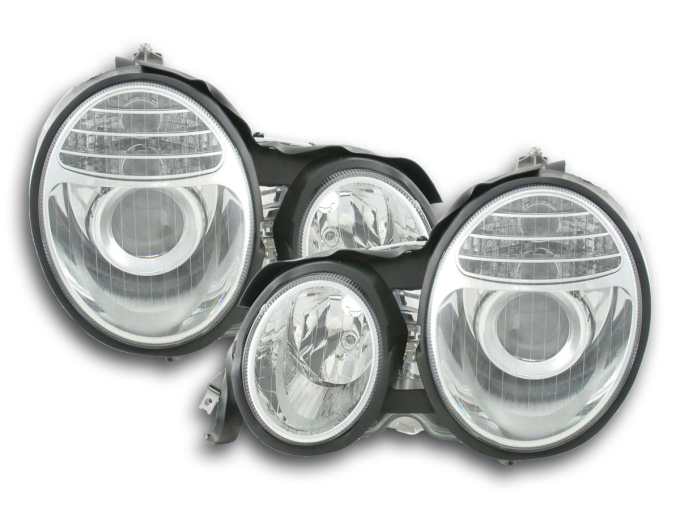 Scheinwerfer Mercedes E-Klasse Typ W210 Bj. 95-98 chromDie Designscheinwerfer ändern die Erscheinung Ihres Fahrzeuges in eine sportliche und zeitlose Optik. Durch die Klarglasoptik werden zudem die Licht und Sichtverhältnisse Ihres Scheinwerfers deutlich verbessert und optimiert. Die sportliche Erscheinung ist dabei nur eine gewünschte und gern gesehene Nebensache! Die Designscheinwerfer haben eine Top Optik zum günstigen Preis und im Regelfall auch deutlich günstiger als originale Austauschscheinwerfer.KEINE KOSTEN EINTRAGUNGSFREI: Die Design Scheinwerfer werden mit e-Zeichen ausgeliefert ( wenn nicht anders angegeben ) und sind somit eintragungsfrei GERINGE EINBAUKOSTEN: Die Design Scheinwerfer können problemlos von jeder Fachwerkstatt binnen ca. 2 Stunden eingebaut werden. Einbauanleitung: Die Scheinwerfer werden komplett mit Kabelbaum und einer englischen Einbauanleitung ausgeliefert. Die Qualität: Die Scheinwerfer sind mit Erstausrüsterqualität zu vergleichen und werden von namhaften Produzenten für den Tuningbereich produziert. Der Preis: Im Regelfall sind diese Tuningscheinwerfer immer günstiger als die originalen Scheinwerfer. Hier lohnt sich ein Preischeck, selbst wenn im Falle eines Unfalls nur ein Scheinwerfer defekt sein sollte. Die Design Scheinwerfer sind eine günstige Umrüstmöglichkeit im Falle eines Unfalls oder einer Nachrüstung. Die Scheinwerfer Technik: Die Scheinwerfer sind nicht nur technisch sondern auch optisch ausgereift und sind im übrigen schon 100.000 fach erfolgreich weltweit eingebaut. Sie möchten Ihrem Fahrzeug eine sportliche Note geben? Dann sollten Sie gleich dieses tolle Scheinwerferset bestellen. Weitere Ausführungsdetails: • Scheinwerfer Klarglasoptik mit transparenter Streuscheibe• verbesserte Lichtausbeute durch Klarglasscheibe und verbesserter Reflektoren• wenn nicht anders angegeben inkl. elektrischer LWR ( Leuchtweitenregulierung ) • Anschluss erfolgt über fahrzeugspezifischen Stecker • Leuchtmittel sind im Lieferumfang nicht enthalten• keine Eintragung und Eintragungskosten in die Papiere nötig, da mit E Prüfzeichen versehen • Einfache Montage da die Original Scheinwerfer Befestigungspunkte des Fahrzeugs verwendet werden• Lange Lebensdauer durch die Verwendung von hochwertigen Material und ChrombeschichtungenLieferumfang:• 1 Satz Scheinwerfer ( links + rechts )