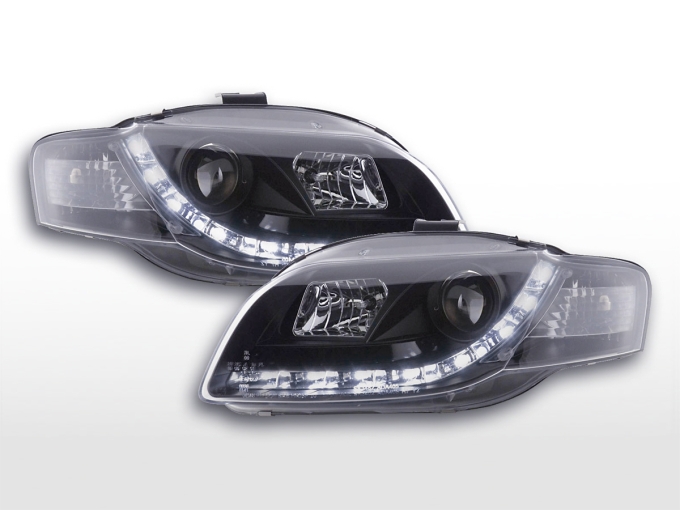 Tagfahrlicht Scheinwerfer Daylight Audi A4 Typ 8E Bj. 04-08 schwarzDie Daylight Scheinwerfer weisen nicht nur in der Nacht sondern auch schon am Tag eine hervorragende sportliche Erscheinung für Ihr Auto aus. Die Eleganten LEDs verleihen Ihrem Auto eine Top Tuning Optik und nebenbei werden Sie auch noch von den anderen Verkehrsteilnehmer besser wahrgenommen! Mit dem Austausch Ihrer Serienscheinwerfer in die Daylightscheinwerfer erhalten Sie eine komplett neue zeitlose exklusive und sportliche Fahrzeugoptik! Nur nebenbei bemerkt sind die Daylight-Scheinwerfer das abgesagteste Design in Sachen Tuningscheinwerfer und verleihen Ihrem Fahrzeug auch eine sportlich aggressive Optik bei Tag und bei Nacht!KEINE KOSTEN EINTRAGUNGSFREI: Die Daylight Scheinwerfer werden mit e-Zeichen ausgeliefert und sind somit eintragungsfrei. GERINGE EINBAUKOSTEN: Die Daylight Scheinwerfer mit integrierten Tagfahrlicht oder auch Tagfahrleuchte genannt können problemlos von jeder Fachwerkstatt binnen ca. 2 Stunden eingebaut werden. Einbauanleitung: Die Scheinwerfer werden komplett mit Kabelbaum und einer "englischen" Einbauanleitung ausgeliefert. Die Qualität: der Scheinwerfer ist mit Erstausrüsterqualität zu vergleichen und werden von namhaften Produzenten für den Tuningbereich produziert. Der Preis: Im Regelfall sind diese Tuningscheinwerfer immer günstiger als die Originalen Scheinwerfer. Hier lohnt sich ein Preischeck, selbst wenn nur im Falle einen Unfalls nur ein Scheinwerfer defekt sein sollte. Die Daylight Scheinwerfer sind eine günstige Umrüstmöglichkeit im Falle eines Unfalls oder eine Nachrüstung.Die Scheinwerfer Technik: Die Scheinwerfer sind nicht nur technisch sondern auch optisch ausgereift und sind im übrigen schon 100.000 fach erfolgreich weltweit eingebaut. Sie möchten Ihrem Fahrzeug eine sportliche Note geben? Dann sollten Sie gleich dieses tolle Scheinwerferset bestellen. Weitere Ausführungsdetails: Scheinwerfer Klarglasoptik mit transparenter Streuscheibeverbesserte Lichtausbeute durch Klarglasscheibe und verbesserter Reflektorenwenn nicht anders angegeben inkl. elektrischer LWR ( Leuchtweitenregulierung ) Anschluss erfolgt über fahrzeugspezifischen Stecker Leuchtmittel sind im Lieferumfang nicht enthaltenkeine Eintragung und Eintragungskosten in die Papiere nötig, da mit "E" Prüfzeichen versehen Einfache Montage da die Original Scheinwerfer Befestigungspunkte des Fahrzeugs verwendet !Lange Lebensdauer durch die Verwendung von hochwertigen Material und ChormbeschichtungenLieferumfang:1 Satz Scheinwerfer ( links + rechts )
