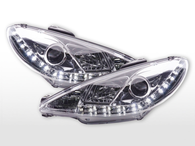 Scheinwerfer Daylight Peugeot 206 Bj. 98-02 chromDie Daylight Scheinwerfer weisen nicht nur in der Nacht sondern auch schon am Tag eine hervorragende sportliche Erscheinung für Ihr Auto aus. Die Eleganten LEDs verleihen Ihrem Auto eine Top Tuning Optik und nebenbei werden Sie auch noch von den anderen Verkehrsteilnehmer besser wahrgenommen! Mit dem Austausch Ihrer Serienscheinwerfer in die Daylightscheinwerfer erhalten Sie eine komplett neue zeitlose exklusive und sportliche Fahrzeugoptik! Nur nebenbei bemerkt sind die Daylight-Scheinwerfer das abgesagteste Design in Sachen Tuningscheinwerfer und verleihen Ihrem Fahrzeug auch eine sportlich aggressive Optik bei Tag und bei Nacht!KEINE KOSTEN EINTRAGUNGSFREI: Die Daylight Scheinwerfer werden mit e-Zeichen ausgeliefert und sind somit eintragungsfrei. GERINGE EINBAUKOSTEN: Die Daylight Scheinwerfer mit integrierten Tagfahrlicht oder auch Tagfahrleuchte genannt können problemlos von jeder Fachwerkstatt binnen ca. 2 Stunden eingebaut werden. Einbauanleitung: Die Scheinwerfer werden komplett mit Kabelbaum und einer "englischen" Einbauanleitung ausgeliefert. Die Qualität: der Scheinwerfer ist mit Erstausrüsterqualität zu vergleichen und werden von namhaften Produzenten für den Tuningbereich produziert. Der Preis: Im Regelfall sind diese Tuningscheinwerfer immer günstiger als die Originalen Scheinwerfer. Hier lohnt sich ein Preischeck, selbst wenn nur im Falle einen Unfalls nur ein Scheinwerfer defekt sein sollte. Die Daylight Scheinwerfer sind eine günstige Umrüstmöglichkeit im Falle eines Unfalls oder eine Nachrüstung.Die Scheinwerfer Technik: Die Scheinwerfer sind nicht nur technisch sondern auch optisch ausgereift und sind im übrigen schon 100.000 fach erfolgreich weltweit eingebaut. Sie möchten Ihrem Fahrzeug eine sportliche Note geben? Dann sollten Sie gleich dieses tolle Scheinwerferset bestellen. Weitere Ausführungsdetails: Scheinwerfer Klarglasoptik mit transparenter Streuscheibeverbesserte Lichtausbeute durch Klarglasscheibe und verbesserter Reflektorenwenn nicht anders angegeben inkl. elektrischer LWR ( Leuchtweitenregulierung ) Anschluss erfolgt über fahrzeugspezifischen Stecker Leuchtmittel sind im Lieferumfang nicht enthaltenkeine Eintragung und Eintragungskosten in die Papiere nötig, da mit "E" Prüfzeichen versehen Einfache Montage da die Original Scheinwerfer Befestigungspunkte des Fahrzeugs verwendet !Lange Lebensdauer durch die Verwendung von hochwertigen Material und ChormbeschichtungenLieferumfang:1 Satz Scheinwerfer ( links + rechts )
