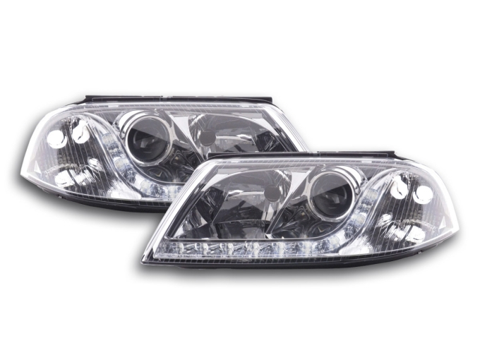 Scheinwerfer Daylight VW Passat Typ 3BG Bj. 00-05 chromDie Daylight Scheinwerfer weisen nicht nur in der Nacht sondern auch schon am Tag eine hervorragende sportliche Erscheinung für Ihr Auto aus. Die Eleganten LEDs verleihen Ihrem Auto eine Top Tuning Optik und nebenbei werden Sie auch noch von den anderen Verkehrsteilnehmer besser wahrgenommen! Mit dem Austausch Ihrer Serienscheinwerfer in die Daylightscheinwerfer erhalten Sie eine komplett neue zeitlose exklusive und sportliche Fahrzeugoptik! Nur nebenbei bemerkt sind die Daylight-Scheinwerfer das abgesagteste Design in Sachen Tuningscheinwerfer und verleihen Ihrem Fahrzeug auch eine sportlich aggressive Optik bei Tag und bei Nacht!KEINE KOSTEN EINTRAGUNGSFREI: Die Daylight Scheinwerfer werden mit e-Zeichen ausgeliefert und sind somit eintragungsfrei. GERINGE EINBAUKOSTEN: Die Daylight Scheinwerfer mit integrierten Tagfahrlicht oder auch Tagfahrleuchte genannt können problemlos von jeder Fachwerkstatt binnen ca. 2 Stunden eingebaut werden. Die Qualität: der Scheinwerfer ist mit Erstausrüsterqualität zu vergleichen und werden von namhaften Produzenten für den Tuningbereich produziert. Der Preis: Im Regelfall sind diese Tuningscheinwerfer immer günstiger als die Originalen Scheinwerfer. Hier lohnt sich ein Preischeck, selbst wenn nur im Falle einen Unfalls nur ein Scheinwerfer defekt sein sollte. Die Daylight Scheinwerfer sind eine günstige Umrüstmöglichkeit im Falle eines Unfalls oder eine Nachrüstung.Die Scheinwerfer Technik: Die Scheinwerfer sind nicht nur technisch sondern auch optisch ausgereift und sind im übrigen schon 100.000 fach erfolgreich weltweit eingebaut. Sie möchten Ihrem Fahrzeug eine sportliche Note geben? Dann sollten Sie gleich dieses tolle Scheinwerferset bestellen. Weitere Ausführungsdetails: Scheinwerfer Klarglasoptik mit transparenter Streuscheibeverbesserte Lichtausbeute durch Klarglasscheibe und verbesserter Reflektorenwenn nicht anders angegeben inkl. elektrischer LWR ( Leuchtweitenregulierung ) Anschluss erfolgt über fahrzeugspezifischen Stecker Leuchtmittel sind im Lieferumfang nicht enthaltenkeine Eintragung und Eintragungskosten in die Papiere nötig, da mit "E" Prüfzeichen versehen Einfache Montage da die Original Scheinwerfer Befestigungspunkte des Fahrzeugs verwendet !Lange Lebensdauer durch die Verwendung von hochwertigen Material und ChormbeschichtungenLieferumfang:1 Satz Scheinwerfer ( links + rechts )