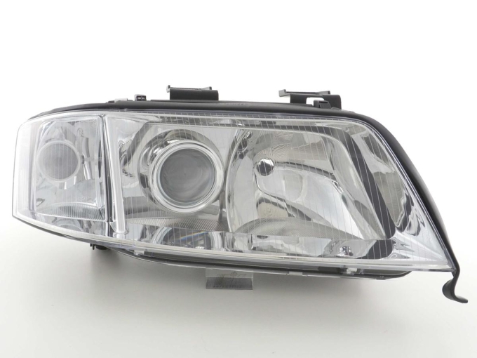 Verschleißteile Scheinwerfer rechts Audi A6 (Typ 4B) Bj. 99-01Die Zubehör Scheinwerfer sind die perfekte Alternative zu den Originalscheinwerfer jedoch preistechnisch im Regelfall deutlich günstiger. Es ist schon ärgerlich genug wenn man in einen Unfall verwickelt war und dann mit hohen Kosten für die Reparatur konfrontiert wird. Mit den Zubehörscheinwerfern haben Sie die Möglichkeit Geld zu sparen und bei der Qualität der Scheinwerfer keine Einbußen zu haben. KEINE KOSTEN EINTRAGUNGSFREI: Die Zubehör Scheinwerfer werden mit e-Zeichen ausgeliefert und sind somit eintragungsfrei GERINGE EINBAUKOSTEN: Die Zubehörscheinwerfer können problemlos von jeder Fachwerkstatt binnen ca. 2 Stunden eingebaut werden. Einbauanleitung: Die Scheinwerfer werden teilweise komplett mit Kabelbaum und einer englischen Einbauanleitung ausgeliefert oder mittels Stecker die auf den Serienkabelbaum passen. Die Qualität: Die Scheinwerfer sind mit Erstausrüsterqualität zu vergleichen und werden von namhaften Produzenten für das Zubehörgeschäft produziert.Der Preis: Im Regelfall sind diese Zubehörscheinwerfer immer günstiger als die Originalen Scheinwerfer. Hier lohnt sich ein Preischeck, selbst wenn im Falle einen Unfalls nur ein Scheinwerfer defekt sein sollte. Die Zubehörscheinwerfer sind eine günstige Umrüstmöglichkeit im Falle eines Unfalls oder im Falle einer Nachrüstung wenn die Streuscheibe bei Steinschlägen in Mitleidenschaft gezogen wurde!Die Scheinwerfer Technik: Die Scheinwerfer sind nicht nur technisch sondern auch optisch ausgereift und sind im übrigen schon 100.000 fach erfolgreich weltweit eingebaut. Sie möchten Ihrem Fahrzeug eine sportliche Note geben? Dann sollten Sie gleich dieses tolle Scheinwerferset bestellen. Weitere Ausführungsdetails: • Scheinwerfer in Originaloptik mit entsprechender Technik• verbesserte Lichtausbeute durch verbesserter Reflektoren und neuerer Technik• wenn nicht anders angegeben inkl. elektrischer LWR ( Leuchtweitenregulierung ) • Anschluss erfolgt über fahrzeugspezifischen Stecker • Leuchtmittel sind im Lieferumfang nicht enthalten• keine Eintragung und Eintragungskosten in die Papiere nötig, da mit E Prüfzeichen versehen • Einfache Montage da die Original Scheinwerfer Befestigungspunkte des Fahrzeugs verwendet werden• Lange Lebensdauer durch die Verwendung von hochwertigen Material und Chrombeschichtungen Lieferumfang:• 1 Scheinwerfer wie angegebenen rechts oder links