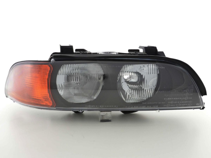 Verschleißteile Scheinwerfer rechts BMW 5er (Typ E39) Bj. 95-00Die Zubehör Scheinwerfer sind die perfekte Alternative zu den Originalscheinwerfer jedoch preistechnisch im Regelfall deutlich günstiger. Es ist schon ärgerlich genug wenn man in einen Unfall verwickelt war und dann mit hohen Kosten für die Reparatur konfrontiert wird. Mit den Zubehörscheinwerfern haben Sie die Möglichkeit Geld zu sparen und bei der Qualität der Scheinwerfer keine Einbußen zu haben. KEINE KOSTEN EINTRAGUNGSFREI: Die Zubehör Scheinwerfer werden mit e-Zeichen ausgeliefert und sind somit eintragungsfrei GERINGE EINBAUKOSTEN: Die Zubehörscheinwerfer können problemlos von jeder Fachwerkstatt binnen ca. 2 Stunden eingebaut werden. Einbauanleitung: Die Scheinwerfer werden teilweise komplett mit Kabelbaum und einer englischen Einbauanleitung ausgeliefert oder mittels Stecker die auf den Serienkabelbaum passen. Die Qualität: Die Scheinwerfer sind mit Erstausrüsterqualität zu vergleichen und werden von namhaften Produzenten für das Zubehörgeschäft produziert.Der Preis: Im Regelfall sind diese Zubehörscheinwerfer immer günstiger als die Originalen Scheinwerfer. Hier lohnt sich ein Preischeck, selbst wenn im Falle einen Unfalls nur ein Scheinwerfer defekt sein sollte. Die Zubehörscheinwerfer sind eine günstige Umrüstmöglichkeit im Falle eines Unfalls oder im Falle einer Nachrüstung wenn die Streuscheibe bei Steinschlägen in Mitleidenschaft gezogen wurde!Die Scheinwerfer Technik: Die Scheinwerfer sind nicht nur technisch sondern auch optisch ausgereift und sind im übrigen schon 100.000 fach erfolgreich weltweit eingebaut. Sie möchten Ihrem Fahrzeug eine sportliche Note geben? Dann sollten Sie gleich dieses tolle Scheinwerferset bestellen. Weitere Ausführungsdetails: • Scheinwerfer in Originaloptik mit entsprechender Technik• verbesserte Lichtausbeute durch verbesserter Reflektoren und neuerer Technik• wenn nicht anders angegeben inkl. elektrischer LWR ( Leuchtweitenregulierung ) • Anschluss erfolgt über fahrzeugspezifischen Stecker • Leuchtmittel sind im Lieferumfang nicht enthalten• keine Eintragung und Eintragungskosten in die Papiere nötig, da mit E Prüfzeichen versehen • Einfache Montage da die Original Scheinwerfer Befestigungspunkte des Fahrzeugs verwendet werden• Lange Lebensdauer durch die Verwendung von hochwertigen Material und Chrombeschichtungen Lieferumfang:• 1 Scheinwerfer wie angegebenen rechts oder links