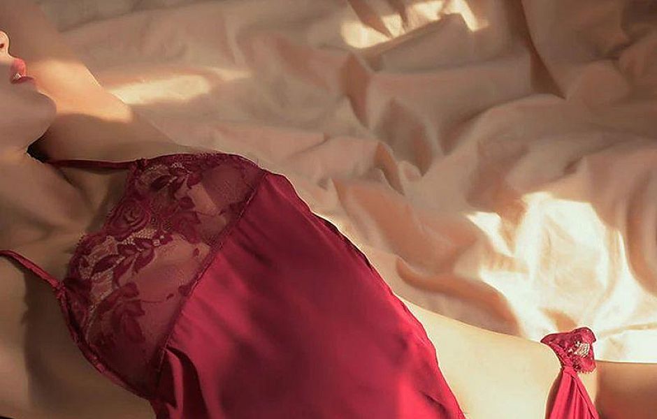 Traumhaftes, weinrotes Nacht-Wäscheset aus einem geschmeidigen, glatten Stoff.