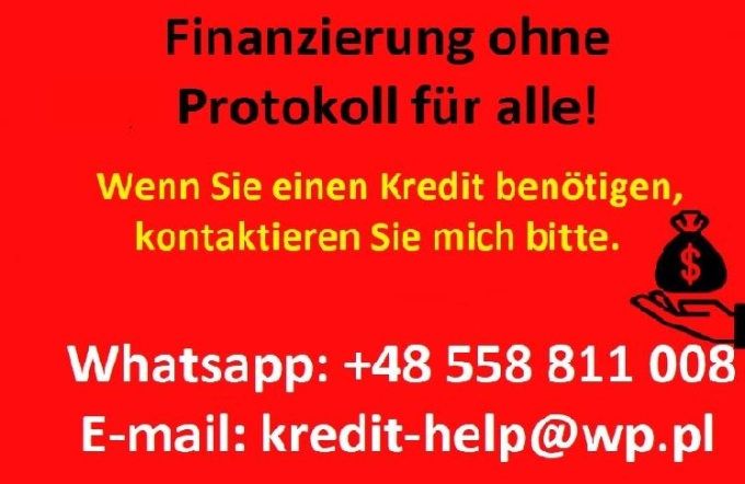 Sie haben ein Kreditproblem? Ihre Bank hat Ihnen einen Kredit verweigert. Wir helfen Ihnen, Ihren Kredit zu bewilligen. Benötigen Sie einen Kredit für den Hauskauf? Für die Gründung eines Unternehmens? Für die Ausübung Ihrer beruflichen Tätigkeit? Die Lösung finden Sie hier. Kontaktieren Sie uns per E-Mail: