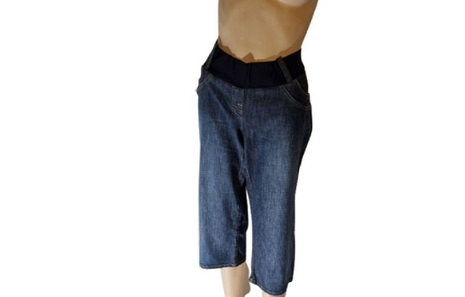 Umstandshose 22220-I christoff dunkelblau Jeans Caprihose kurz 4/5-Länge Taillenhöhe Größe 42 Gesamtlänge ohne Stretchbund ca. 72 cm Schrittlänge ca. 54 cm Stretchbund lose ca. 45 cm Bundhöhe ca. 6 cm Oberschenkelweite ca. 30 cm Hosenschlag ca. 23 cm 2 Taschen vorne / 2 Taschen hinten