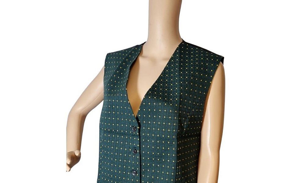 Weste 22401 Damenweste grün mit gelben Punkten 2 Taschen 5-fach Knopfleiste / Knöpfe mit Herstellerlogo Vorderlänge ca. 59 cm Rückenlänge ca. 59 cm Achselnaht zu Achselnaht ca. 50 cm