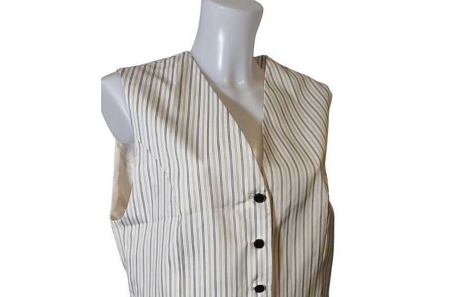 Weste 22558 Jobeline beige mit Längsstreifen Damenweste Hinweis: Bei Größe 38 fehlt ein Knopf. Ein Ersatzknopf ist inseitig angenäht. (Preis wurde reduziert!)