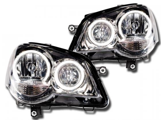 Scheinwerfer Angel Eyes VW Polo Typ 9N2 Bj. 05-09 schwarzDie Angel Eyes Scheinwerfer gehören zu den Cultscheinwefer und verschönern nicht nur die Optik des Fahrzeuges bei Tag sondern auch bei Nacht! Die sogenannten Engelaugen lassen Ihr Auto in einer ganz neuen Optik erstrahlen. Bei den Scheinwerfer sehen Sie um den Reflektor eine runden Ring, der mit dahinterliegenden Birnen beleuchtet wird. Im Regelfall hat der Scheinwerfer zwei beleuchtete Angel Eyes Ringe was zu einer sportlichen oder auch aggressiveren Optik führt.KEINE KOSTEN EINTRAGUNGSFREI: Die Angel Eyes Scheinwerfer werden mit e-Zeichen ausgeliefert und sind somit eintragungsfrei. GERINGE EINBAUKOSTEN: Die Angel Eyes Scheinwerfer können problemlos von jeder Fachwerkstatt binnen ca. 2 Stunden eingebaut werden. Einbauanleitung: Die Scheinwerfer werden komplett mit Kabelbaum und einer "englischen" Einbauanleitung ausgeliefert. Die Qualität: der Scheinwerfer ist mit Erstausrüsterqualität zu vergleichen und werden von namhaften Produzenten für den Tuningbereich produziert. Der Preis: Im Regelfall sind diese Tuningscheinwerfer immer günstiger als die Originalen Scheinwerfer. Hier lohnt sich ein Preischeck, selbst wenn nur im Falle einen Unfalls nur ein Scheinwerfer defekt sein sollte. Die Angel Eyes Scheinwerfer sind eine günstige Umrüstmöglichkeit im Falle eines Unfalls oder eine Nachrüstung.Die Scheinwerfer Technik: Die Scheinwerfer sind nicht nur technisch sondern auch optisch ausgereift und sind im übrigen schon 100.000 fach erfolgreich weltweit eingebaut. Sie möchten Ihrem Fahrzeug eine sportliche Note geben? Dann sollten Sie gleich dieses tolle Scheinwerferset bestellen.Weitere Ausführungsdetails: Scheinwerfer Klarglasoptik mit transparenter Streuscheibeverbesserte Lichtausbeute durch Klarglasscheibe und verbesserter Refeltorenwenn nicht anders angegeben inkl. elektrischer LWR ( Leuchtweitenregulierung ) Anschluss erfolgt über fahrzeugspezifischen Stecker Leuchtmittel sind im Lieferumfang nicht enthaltenkeine Eintragung und Eintragungskosten in die Papiere nötig, da mit "E" Prüfzeichen versehen Einfache Montage da die Original Scheinwerfer Befestigungspunkte des Fahrzeugs verwendet !Lange Lebensdauer durch die Verwendung von hochwertigen Material und ChormbeschichtungenLieferumfang:1 Satz Scheinwerfer ( links + rechts )