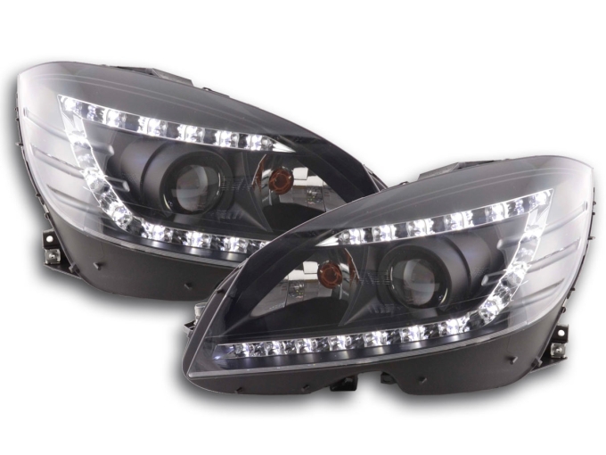 Scheinwerfer Daylight Mercedes C-Klasse Typ 204 schwarz XenonDie Daylight Scheinwerfer weisen nicht nur in der Nacht sondern auch schon am Tag eine hervorragende sportliche Erscheinung für Ihr Auto aus. Die Eleganten LEDs verleihen Ihrem Auto eine Top Tuning Optik und nebenbei werden Sie auch noch von den anderen Verkehrsteilnehmer besser wahrgenommen! Mit dem Austausch Ihrer Serienscheinwerfer in die Daylightscheinwerfer erhalten Sie eine komplett neue zeitlose exklusive und sportliche Fahrzeugoptik! Nur nebenbei bemerkt sind die Daylight-Scheinwerfer das abgesagteste Design in Sachen Tuningscheinwerfer und verleihen Ihrem Fahrzeug auch eine sportlich aggressive Optik bei Tag und bei Nacht!KEINE KOSTEN EINTRAGUNGSFREI: Die Daylight Scheinwerfer werden mit e-Zeichen ausgeliefert und sind somit eintragungsfrei. GERINGE EINBAUKOSTEN: Die Daylight Scheinwerfer mit integrierten Tagfahrlicht oder auch Tagfahrleuchte genannt können problemlos von jeder Fachwerkstatt binnen ca. 2 Stunden eingebaut werden. Einbauanleitung: Die Scheinwerfer werden komplett mit Kabelbaum und einer "englischen" Einbauanleitung ausgeliefert. Die Qualität: der Scheinwerfer ist mit Erstausrüsterqualität zu vergleichen und werden von namhaften Produzenten für den Tuningbereich produziert. Der Preis: Im Regelfall sind diese Tuningscheinwerfer immer günstiger als die Originalen Scheinwerfer. Hier lohnt sich ein Preischeck, selbst wenn nur im Falle einen Unfalls nur ein Scheinwerfer defekt sein sollte. Die Daylight Scheinwerfer sind eine günstige Umrüstmöglichkeit im Falle eines Unfalls oder eine Nachrüstung.Die Scheinwerfer Technik: Die Scheinwerfer sind nicht nur technisch sondern auch optisch ausgereift und sind im übrigen schon 100.000 fach erfolgreich weltweit eingebaut. Sie möchten Ihrem Fahrzeug eine sportliche Note geben? Dann sollten Sie gleich dieses tolle Scheinwerferset bestellen. Weitere Ausführungsdetails: Scheinwerfer Klarglasoptik mit transparenter Streuscheibeverbesserte Lichtausbeute durch Klarglasscheibe und verbesserter Reflektorenwenn nicht anders angegeben inkl. elektrischer LWR ( Leuchtweitenregulierung ) Anschluss erfolgt über fahrzeugspezifischen Stecker Leuchtmittel sind im Lieferumfang nicht enthaltenkeine Eintragung und Eintragungskosten in die Papiere nötig, da mit "E" Prüfzeichen versehen Einfache Montage da die Original Scheinwerfer Befestigungspunkte des Fahrzeugs verwendet !Lange Lebensdauer durch die Verwendung von hochwertigen Material und ChormbeschichtungenLieferumfang:1 Satz Scheinwerfer ( links + rechts )