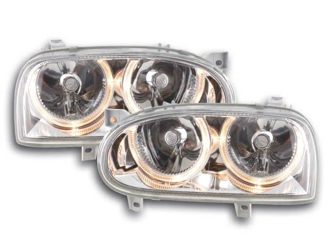 Scheinwerfer Angel Eyes VW Golf 3 Typ 1HXO, 1 EXO Bj. 91-97 chromDie Angel Eyes Scheinwerfer gehören zu denKultscheinwefer und verschönern nicht nur die Optik des Fahrzeuges bei Tagsondern auch bei Nacht! Die sogenannten Engelaugen lassen Ihr Auto in einerganz neuen Optik erstrahlen. Bei den Scheinwerfer sehen Sie um den Reflektoreine runden Ring, der mit dahinterliegenden Birnen beleuchtet wird. Dank derbeiden LED Ringe erhalten sie ein helles weißes Licht mit einemunverwechselbaren Tuning Look. Im Regelfall hat der Scheinwerfer zweibeleuchtete Angel Eyes Ringe was zu einer sportlichen oder auch aggressiverenOptik führt.KEINE KOSTEN EINTRAGUNGSFREI: Die Angel EyesScheinwerfer werden mit e-Zeichen ausgeliefert und sind somit eintragungsfrei. GERINGE EINBAUKOSTEN: Die Angel EyesScheinwerfer können problemlos von jeder Fachwerkstatt binnen ca. 2 Stundeneingebaut werden.Einbauanleitung: Die Scheinwerferwerden komplett mit Kabelbaum und einer "englischen" Einbauanleitungausgeliefert. Die Qualität: der Scheinwerferist mit Erstausrüsterqualität zu vergleichen und werden von namhaftenProduzenten für den Tuningbereich produziert. Der Preis: Im Regelfall sinddiese Tuningscheinwerfer immer günstiger als die Originalen Scheinwerfer. Hierlohnt sich ein Preischeck, selbst wenn nur im Falle einen Unfalls nur ein Scheinwerferdefekt sein sollte. Die Angel Eyes Scheinwerfer sind eine günstigeUmrüstmöglichkeit im Falle eines Unfalls oder eine Nachrüstung.Die Scheinwerfer Technik: Die Scheinwerfersind nicht nur technisch sondern auch optisch ausgereift und sind im übrigenschon 100.000 fach erfolgreich weltweit eingebaut. Sie möchten Ihrem Fahrzeugeine sportliche Note geben? Dann sollten Sie gleich dieses tolleScheinwerferset bestellen.WeitereAusführungsdetails: · ScheinwerferKlarglasoptik mit transparenter Streuscheibe· verbesserteLichtausbeute durch Klarglasscheibe und verbesserter Reflektoren· wennnicht anders angegeben inkl. elektrischer LWR ( Leuchtweitenregulierung ) · Anschlusserfolgt über fahrzeugspezifischen Stecker · Leuchtmittelsind im Lieferumfang nicht enthalten· keineEintragung und Eintragungskosten in die Papiere nötig, da mit "E"Prüfzeichen versehen · EinfacheMontage da die Original Scheinwerfer Befestigungspunkte des Fahrzeugs verwendet!· LangeLebensdauer durch die Verwendung von hochwertigen Material undChormbeschichtungenLieferumfang:· 1Satz Scheinwerfer( links + rechts ) mit Blinkleuchten