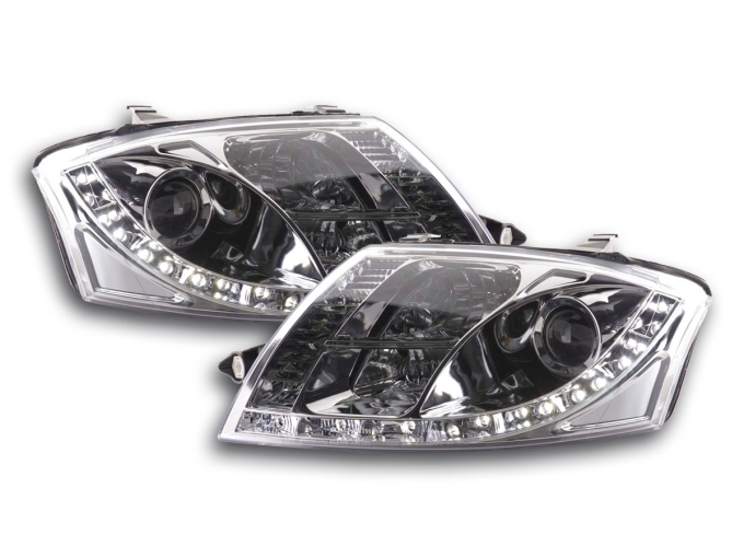 Scheinwerfer Daylight Audi TT Typ 8N Bj. 99-05 chromDie Daylight Scheinwerfer weisen nicht nur in der Nacht sondern auch schon am Tag eine hervorragende sportliche Erscheinung für Ihr Auto aus. Die Eleganten LEDs verleihen Ihrem Auto eine Top Tuning Optik und nebenbei werden Sie auch noch von den anderen Verkehrsteilnehmer besser wahrgenommen! Mit dem Austausch Ihrer Serienscheinwerfer in die Daylightscheinwerfer erhalten Sie eine komplett neue zeitlose exklusive und sportliche Fahrzeugoptik! Nur nebenbei bemerkt sind die Daylight-Scheinwerfer das abgesagteste Design in Sachen Tuningscheinwerfer und verleihen Ihrem Fahrzeug auch eine sportlich aggressive Optik bei Tag und bei Nacht!KEINE KOSTEN EINTRAGUNGSFREI: Die Daylight Scheinwerfer werden mit e-Zeichen ausgeliefert und sind somit eintragungsfrei. GERINGE EINBAUKOSTEN: Die Daylight Scheinwerfer mit integrierten Tagfahrlicht oder auch Tagfahrleuchte genannt können problemlos von jeder Fachwerkstatt binnen ca. 2 Stunden eingebaut werden. Einbauanleitung: Die Scheinwerfer werden komplett mit Kabelbaum und einer "englischen" Einbauanleitung ausgeliefert. Die Qualität: der Scheinwerfer ist mit Erstausrüsterqualität zu vergleichen und werden von namhaften Produzenten für den Tuningbereich produziert. Der Preis: Im Regelfall sind diese Tuningscheinwerfer immer günstiger als die Originalen Scheinwerfer. Hier lohnt sich ein Preischeck, selbst wenn nur im Falle einen Unfalls nur ein Scheinwerfer defekt sein sollte. Die Daylight Scheinwerfer sind eine günstige Umrüstmöglichkeit im Falle eines Unfalls oder eine Nachrüstung.Die Scheinwerfer Technik: Die Scheinwerfer sind nicht nur technisch sondern auch optisch ausgereift und sind im übrigen schon 100.000 fach erfolgreich weltweit eingebaut. Sie möchten Ihrem Fahrzeug eine sportliche Note geben? Dann sollten Sie gleich dieses tolle Scheinwerferset bestellen. Weitere Ausführungsdetails: Scheinwerfer Klarglasoptik mit transparenter Streuscheibeverbesserte Lichtausbeute durch Klarglasscheibe und verbesserter Reflektorenwenn nicht anders angegeben inkl. elektrischer LWR ( Leuchtweitenregulierung ) Anschluss erfolgt über fahrzeugspezifischen Stecker Leuchtmittel sind im Lieferumfang nicht enthaltenkeine Eintragung und Eintragungskosten in die Papiere nötig, da mit "E" Prüfzeichen versehen Einfache Montage da die Original Scheinwerfer Befestigungspunkte des Fahrzeugs verwendet !Lange Lebensdauer durch die Verwendung von hochwertigen Material und ChormbeschichtungenLieferumfang:1 Satz Scheinwerfer ( links + rechts )