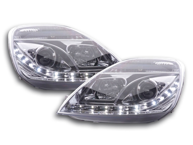 Scheinwerfer Daylight Ford Fiesta Typ MK6 Bj. 03-07 chromDie Daylight Scheinwerfer weisen nicht nur in der Nacht sondern auch schon am Tag eine hervorragende sportliche Erscheinung für Ihr Auto aus. Die Eleganten LEDs verleihen Ihrem Auto eine Top Tuning Optik und nebenbei werden Sie auch noch von den anderen Verkehrsteilnehmer besser wahrgenommen! Mit dem Austausch Ihrer Serienscheinwerfer in die Daylightscheinwerfer erhalten Sie eine komplett neue zeitlose exklusive und sportliche Fahrzeugoptik! Nur nebenbei bemerkt sind die Daylight-Scheinwerfer das abgesagteste Design in Sachen Tuningscheinwerfer und verleihen Ihrem Fahrzeug auch eine sportlich aggressive Optik bei Tag und bei Nacht!KEINE KOSTEN EINTRAGUNGSFREI: Die Daylight Scheinwerfer werden mit e-Zeichen ausgeliefert und sind somit eintragungsfrei. GERINGE EINBAUKOSTEN: Die Daylight Scheinwerfer mit integrierten Tagfahrlicht oder auch Tagfahrleuchte genannt können problemlos von jeder Fachwerkstatt binnen ca. 2 Stunden eingebaut werden. Einbauanleitung: Die Scheinwerfer werden komplett mit Kabelbaum und einer "englischen" Einbauanleitung ausgeliefert. Die Qualität: der Scheinwerfer ist mit Erstausrüsterqualität zu vergleichen und werden von namhaften Produzenten für den Tuningbereich produziert. Der Preis: Im Regelfall sind diese Tuningscheinwerfer immer günstiger als die Originalen Scheinwerfer. Hier lohnt sich ein Preischeck, selbst wenn nur im Falle einen Unfalls nur ein Scheinwerfer defekt sein sollte. Die Daylight Scheinwerfer sind eine günstige Umrüstmöglichkeit im Falle eines Unfalls oder eine Nachrüstung.Die Scheinwerfer Technik: Die Scheinwerfer sind nicht nur technisch sondern auch optisch ausgereift und sind im übrigen schon 100.000 fach erfolgreich weltweit eingebaut. Sie möchten Ihrem Fahrzeug eine sportliche Note geben? Dann sollten Sie gleich dieses tolle Scheinwerferset bestellen. Weitere Ausführungsdetails: Scheinwerfer Klarglasoptik mit transparenter Streuscheibeverbesserte Lichtausbeute durch Klarglasscheibe und verbesserter Reflektorenwenn nicht anders angegeben inkl. elektrischer LWR ( Leuchtweitenregulierung ) Anschluss erfolgt über fahrzeugspezifischen Stecker Leuchtmittel sind im Lieferumfang nicht enthaltenkeine Eintragung und Eintragungskosten in die Papiere nötig, da mit "E" Prüfzeichen versehen Einfache Montage da die Original Scheinwerfer Befestigungspunkte des Fahrzeugs verwendet !Lange Lebensdauer durch die Verwendung von hochwertigen Material und ChormbeschichtungenLieferumfang:1 Satz Scheinwerfer ( links + rechts )
