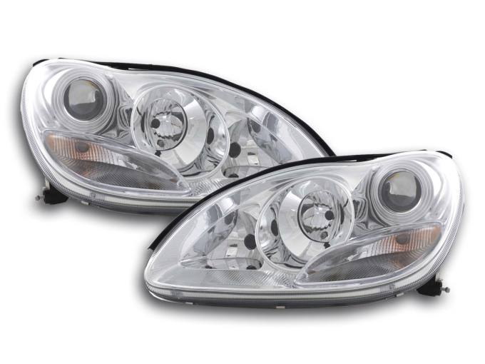 Scheinwerfer Mercedes S-Klasse Typ W220 Bj. 02-05 chromDie Designscheinwerfer ändern die Erscheinung Ihres Fahrzeuges in eine sportliche und zeitlose Optik. Durch die Klarglasoptik werden zudem die Licht und Sichtverhältnisse Ihres Scheinwerfers deutlich verbessert und optimiert. Die sportliche Erscheinung ist dabei nur eine gewünschte und gern gesehene Nebensache! Die Designscheinwerfer haben eine Top Optik zum günstigen Preis und im Regelfall auch deutlich günstiger als originale Austauschscheinwerfer.KEINE KOSTEN EINTRAGUNGSFREI: Die Design Scheinwerfer werden mit e-Zeichen ausgeliefert ( wenn nicht anders angegeben ) und sind somit eintragungsfrei GERINGE EINBAUKOSTEN: Die Design Scheinwerfer können problemlos von jeder Fachwerkstatt binnen ca. 2 Stunden eingebaut werden. Einbauanleitung: Die Scheinwerfer werden komplett mit Kabelbaum und einer englischen Einbauanleitung ausgeliefert. Die Qualität: Die Scheinwerfer sind mit Erstausrüsterqualität zu vergleichen und werden von namhaften Produzenten für den Tuningbereich produziert. Der Preis: Im Regelfall sind diese Tuningscheinwerfer immer günstiger als die originalen Scheinwerfer. Hier lohnt sich ein Preischeck, selbst wenn im Falle eines Unfalls nur ein Scheinwerfer defekt sein sollte. Die Design Scheinwerfer sind eine günstige Umrüstmöglichkeit im Falle eines Unfalls oder einer Nachrüstung. Die Scheinwerfer Technik: Die Scheinwerfer sind nicht nur technisch sondern auch optisch ausgereift und sind im übrigen schon 100.000 fach erfolgreich weltweit eingebaut. Sie möchten Ihrem Fahrzeug eine sportliche Note geben? Dann sollten Sie gleich dieses tolle Scheinwerferset bestellen. Weitere Ausführungsdetails: • Scheinwerfer Klarglasoptik mit transparenter Streuscheibe• verbesserte Lichtausbeute durch Klarglasscheibe und verbesserter Reflektoren• wenn nicht anders angegeben inkl. elektrischer LWR ( Leuchtweitenregulierung ) • Anschluss erfolgt über fahrzeugspezifischen Stecker • Leuchtmittel sind im Lieferumfang nicht enthalten• keine Eintragung und Eintragungskosten in die Papiere nötig, da mit E Prüfzeichen versehen • Einfache Montage da die Original Scheinwerfer Befestigungspunkte des Fahrzeugs verwendet werden• Lange Lebensdauer durch die Verwendung von hochwertigen Material und ChrombeschichtungenLieferumfang:• 1 Satz Scheinwerfer ( links + rechts )