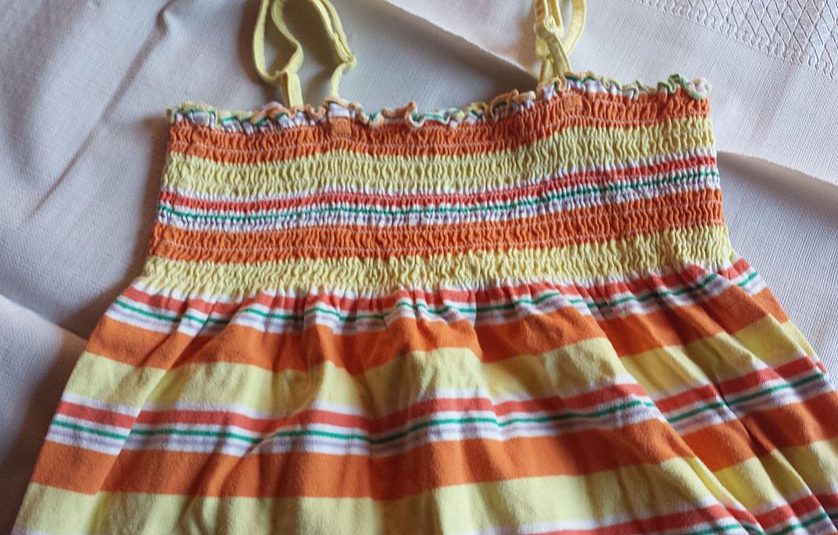Wundervolles Mädchenkleid in weiss mit bunten querstreifen in gelb, orange, kleine dünne streifen in grün und lila.