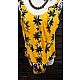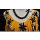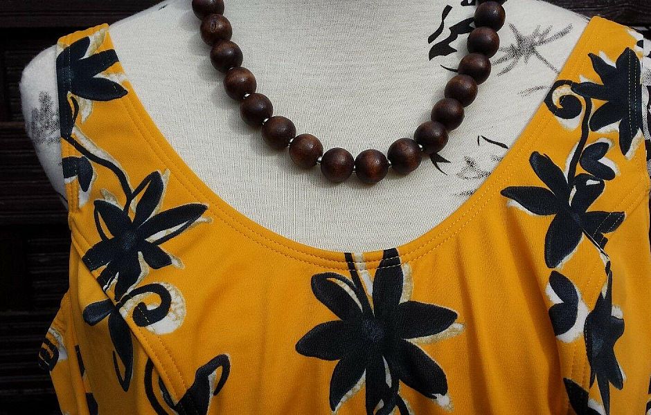 sonnengelber-badeanzug mit schwarz-beigen blüten.